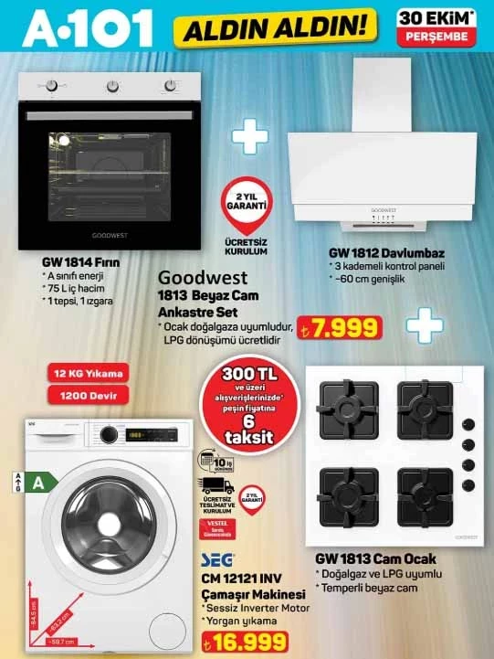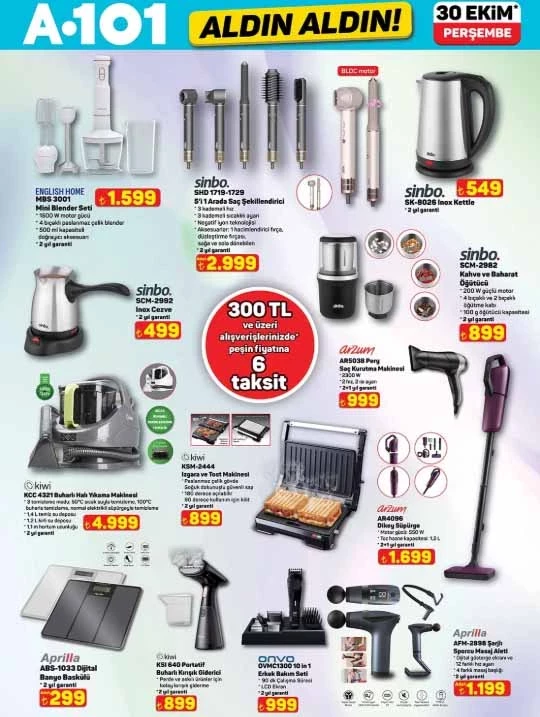 30 Ekim A101 aktüel ürünler kataloğunda dikkat çeken fırsatlar arasında 3’lü beyaz cam ankastre set, buharlı halı yıkama makinesi, kahve ve baharat öğütücü, çok amaçlı aktivite koltuğu ve boy boy valiz modelleri yer alıyor. Ayrıca mutfak, temizlik, kişisel bakım ve oyuncak kategorilerinde de çeşitli ürünlerde indirimler var.